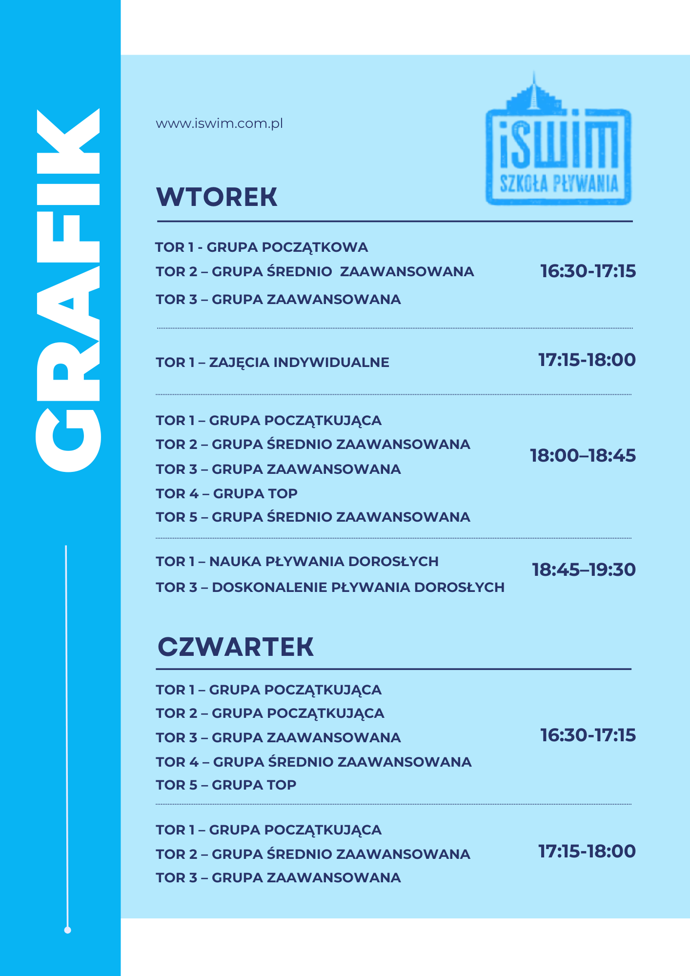 Zapraszamy do zapoznania się z naszym grafikiem zajęć w szkole pływania iSwim we Wrocławiu. Oferujemy elastyczne godziny zajęć dla dzieci, młodzieży i dorosłych, dostosowane do Waszych potrzeb. Regularnie aktualizujemy grafik, aby zapewnić dostępność miejsc i komfort uczestników.